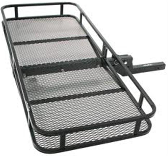 Great for extra storage while traveling, hauling a big load of firewood and so much more. Boasts heavy-duty steel-tube construction and a powder-coated finish for durability. Works with 2'' hitch receivers. This is the folding version.